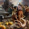 This painting is a modern adaption of the fall of Troy. In adapting the story to our times certain key details are kept as is such as the Trojan horse, the sacking of a city and carrying off of treasures. But other details accentuate my own perspective based on living in what I see as a decadent and rapidly degenerating empire. You will notice that the painting and sculptures carried away by the soldiers are icons of western anglo Saxon and classical culture. The portrait is queen Elizabeth and the bust is Augustus. By setting aside their own standards in the name of conquest or progress the modern stand ins for the Greeks have undermined and plundered the foundations of their own culture. In the wake of this destruction, the void is filled by the most basic instincts and the lowest level of the shake as our primal nature is ultimately the one forefront that we cannot eradicate. This is visible in the filming of the nude woman.